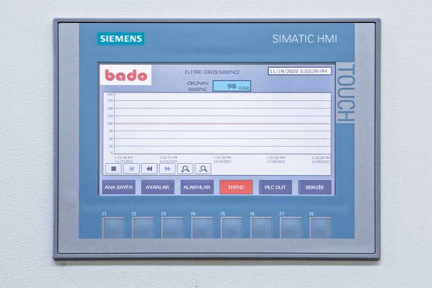 BADO FİLTRE Elektrik sistemi PLC sistemi ile desteklenmektedir. PLC sistemi ile kumanda edilir. Ekran üzerinde basınç artışını takip edebileceğiniz grafik bulunmaktadır. İstenilen basınca geldiğinde filtre değişim uyarısı vererek operatörü filtre değişimi için sesli ve ışıklı olarak uyarmaktadır. Prosese göre ayarlanan değişim basınçları ve hava atma süreleri ekran üzerinden ayarlanır ve takip edilebilir. Filtre değişimi belirlenen sıralamaya göre PLC yönergeleri ile otomatik yapılmaktadır.